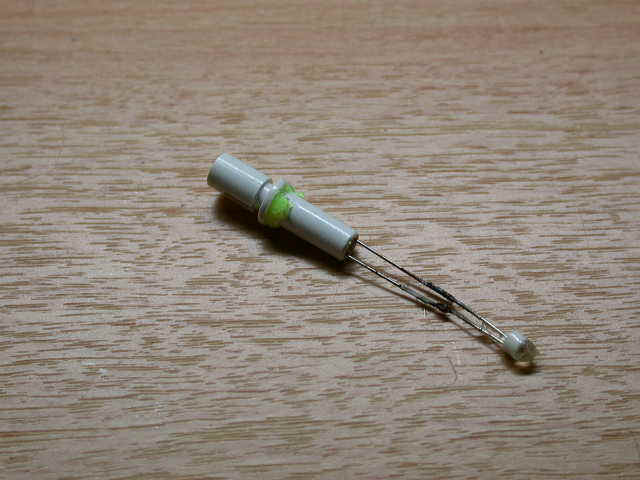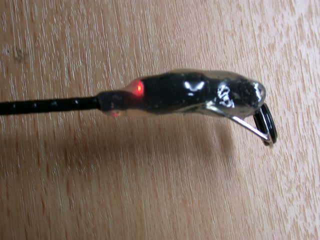 竿先から取り出したリード線にLEDをはんだ付けして接続する。通電して点灯を確認したらゴムテープで固定し、更に保護のためホットメルトで竿先全体を覆う。ホットメルトは溶かして熱いうちは透明で、冷めてくると白っぽくなるが、視認性には問題無い。