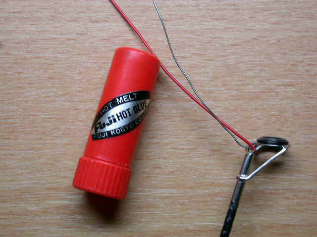 (4) リード線を竿内に通したあと、竿先ガイドをホットグルーを使用して取り付ける。