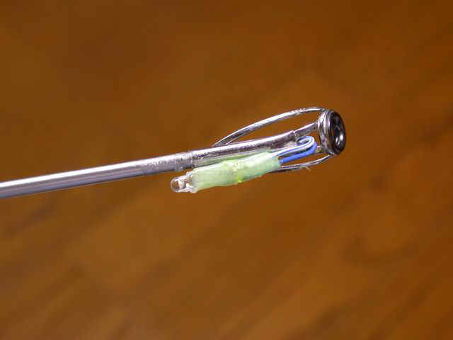 トップの竿先にLEDを取り付け、そこからリード線を竿内を通し、竿尻側のリチウム電池ソケットに接続する。