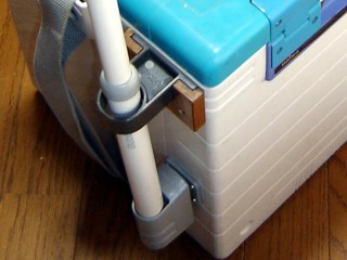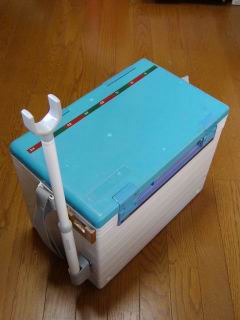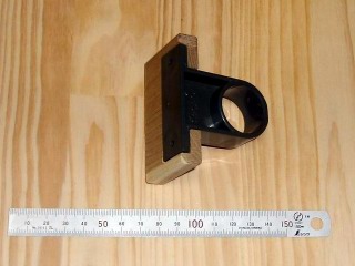| 追加サポートの部品。 左はイレクターφ28のプラスチックジョイント型番J-102A。 http://www.diy-life.net/parts/plastic-joint/pj_list_04.html 右は木材(エンジュ)の端材を加工したもの。 |