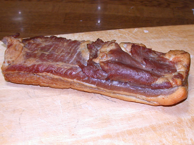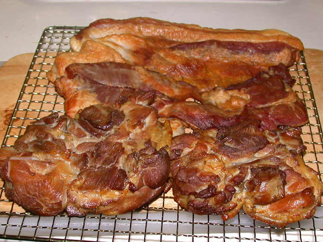 燻製定番のベーコン。 豚バラ(奥)と鶏モモ(手前)