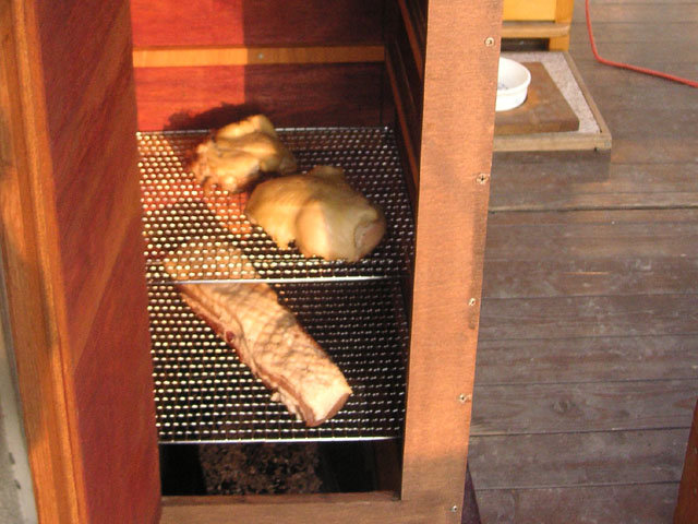 燻製作業中。 数段に金網をセットできるようにしています。上面と側面に材料出し入れ用の扉、前面下部には熱源と燻煙チップを入れる扉があります。