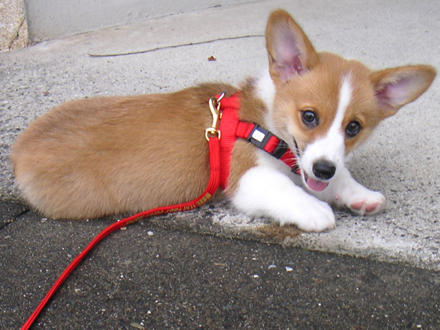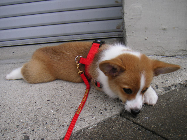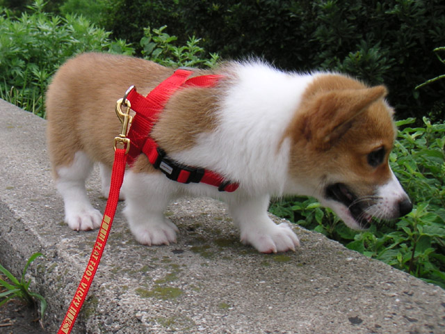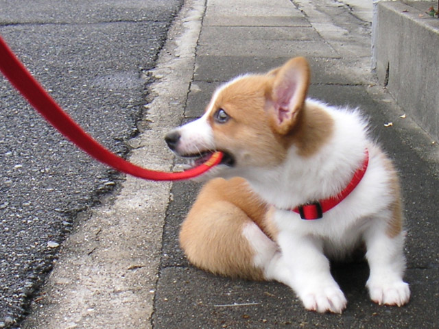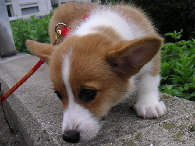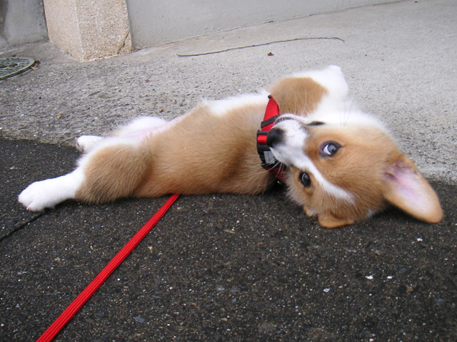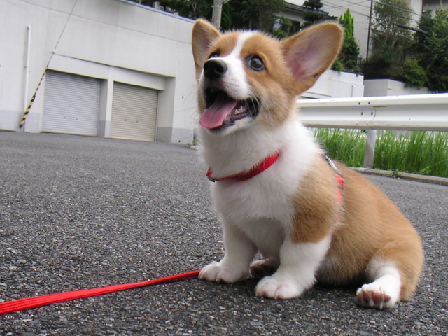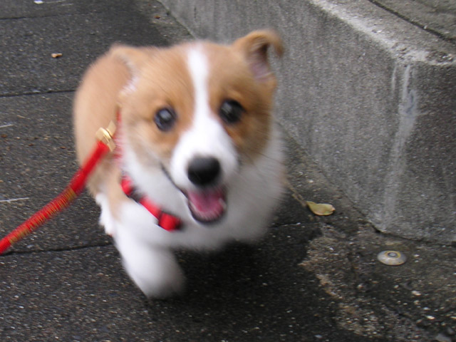 初めてのお散歩は、家を出たところでちっこいテリヤちゃんに遭遇。