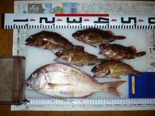 | 2009.08.23 久々のおかず大漁。 ガシラ大型は煮付け。 ガシラ小型は唐揚げ。 ベラは南蛮漬け。 アナゴは煮アナゴ。 押し寿司 |