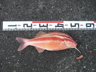 | 同行のST会長が「おじさん(ヒメジ科)」をゲット。 おじさんは標準和名。ひげが長いのが名前の由来。 大物っぽいが、投げ釣りの対象魚でなく、勝敗に影響なし。 ただし、「食べる」の観点では高級魚で超美味と。 もう一人の同行者はイセエビを1尾ゲット。こちらも高級食材。 |