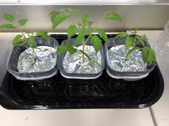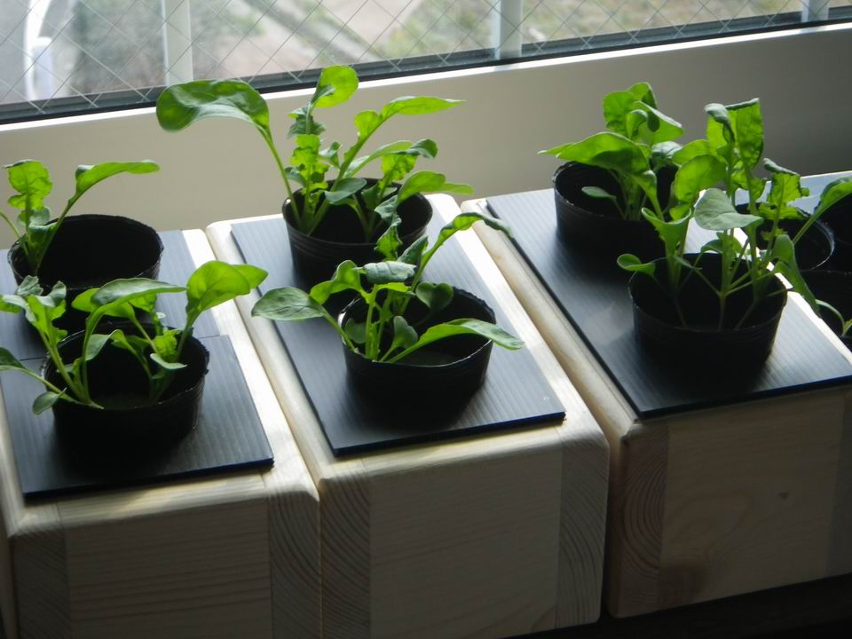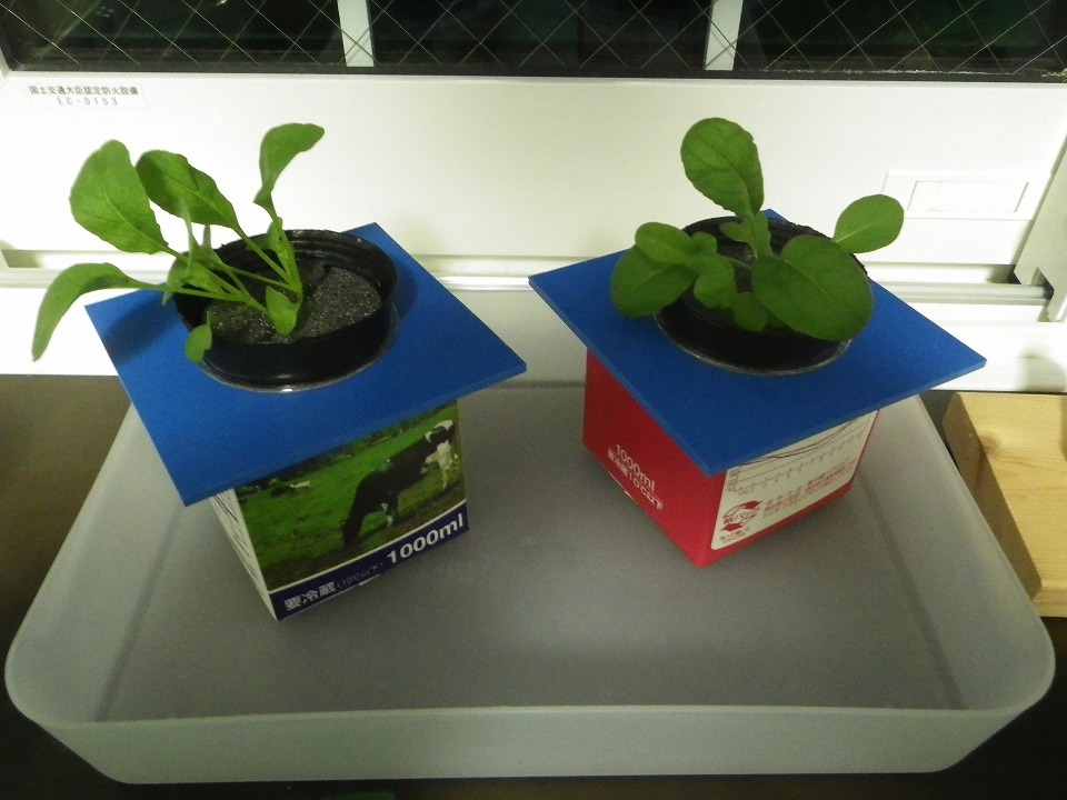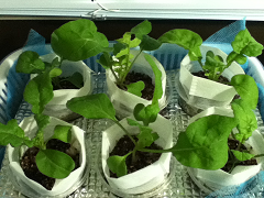 ← タンク:平容器、バット ポット下部を平バットに浸して栽培する方法は 「いつでもレタス」に紹介されているが、 昨年は用いておらず、今年が初挑戦。 日除けをしてないとバット内が藻だらけに なりそうな気もするが、さて。 |