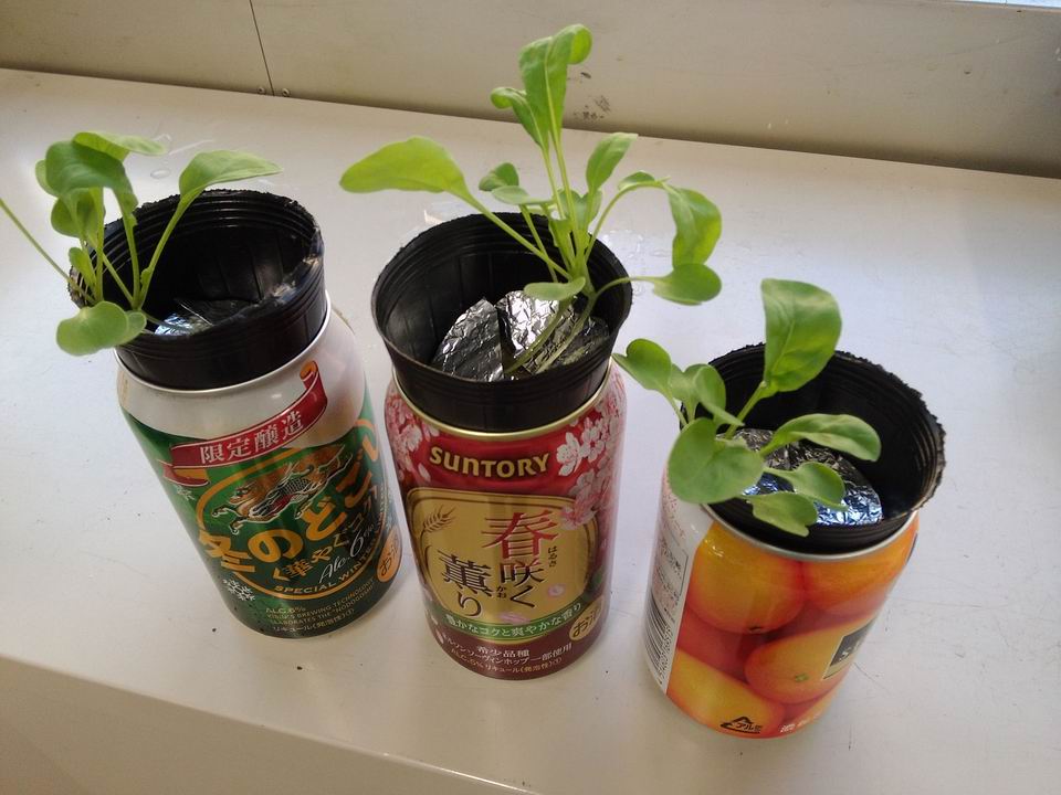 タンク:空き飲料缶(缶切りで上面を切取る) 6cmポリポットがピッタリ載って蓋が不要 |