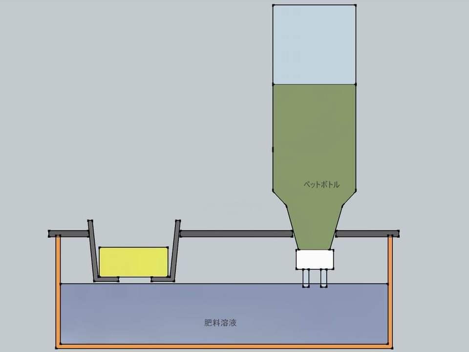 タンク液面が低下して側面穴上縁より低くなると、空気がペットボトルに入りこみ、内部の液体がタンク内に流出する。